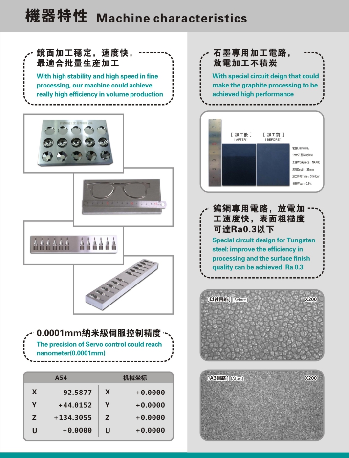 采用FC-350鑄件,材質精密、韌性強,經回火處理及自然風化, 經久耐用,不易變形。 工作臺面經過高周波熱處理與精密研磨,硬度高,表面不易磨損。 高精度主軸組件確保設備擁有較佳的放電特性。